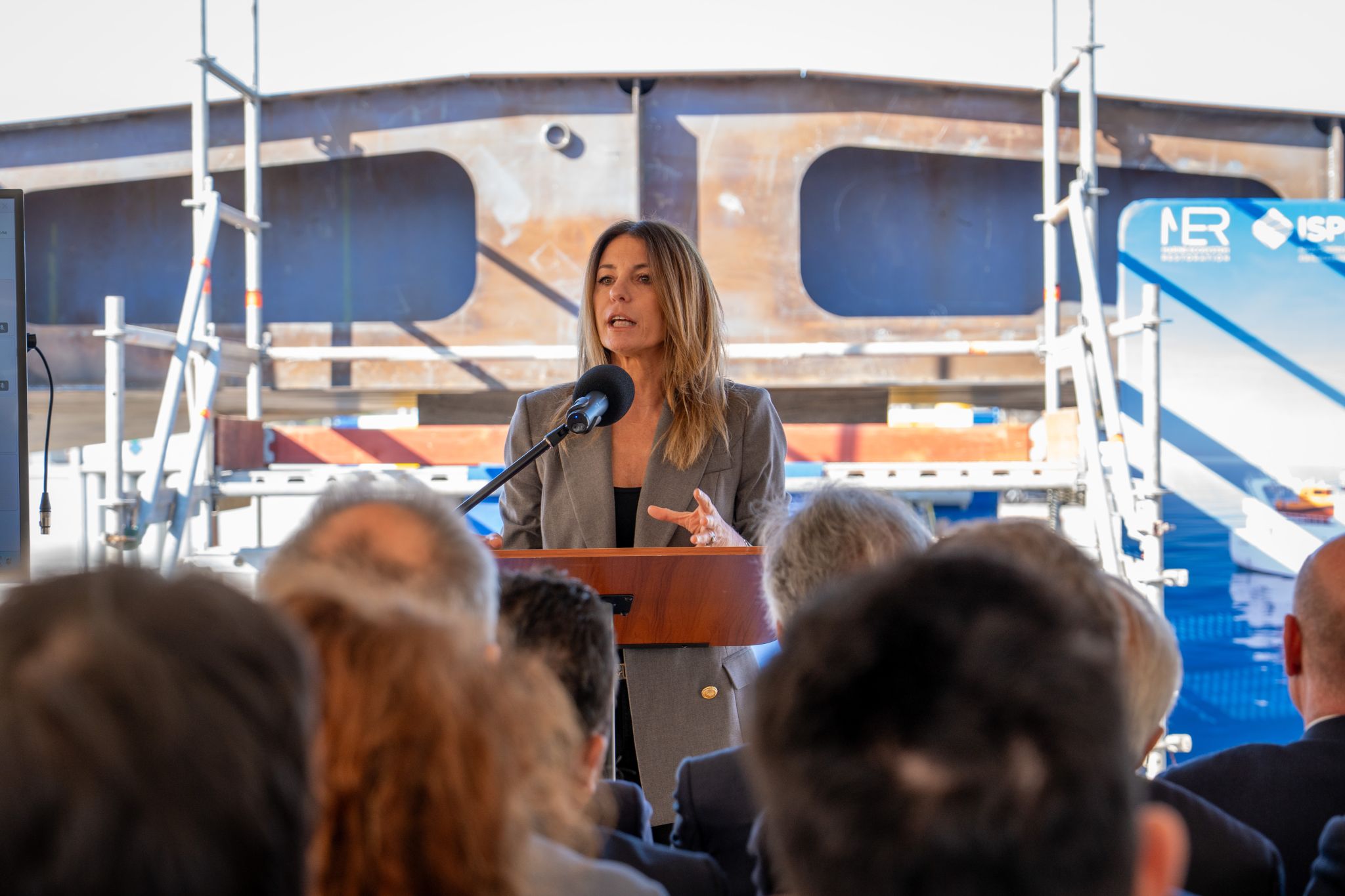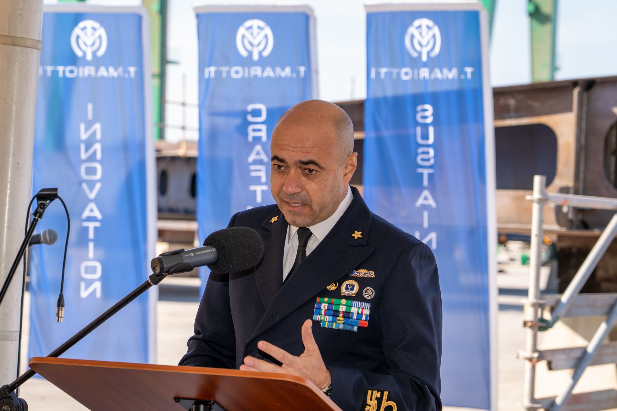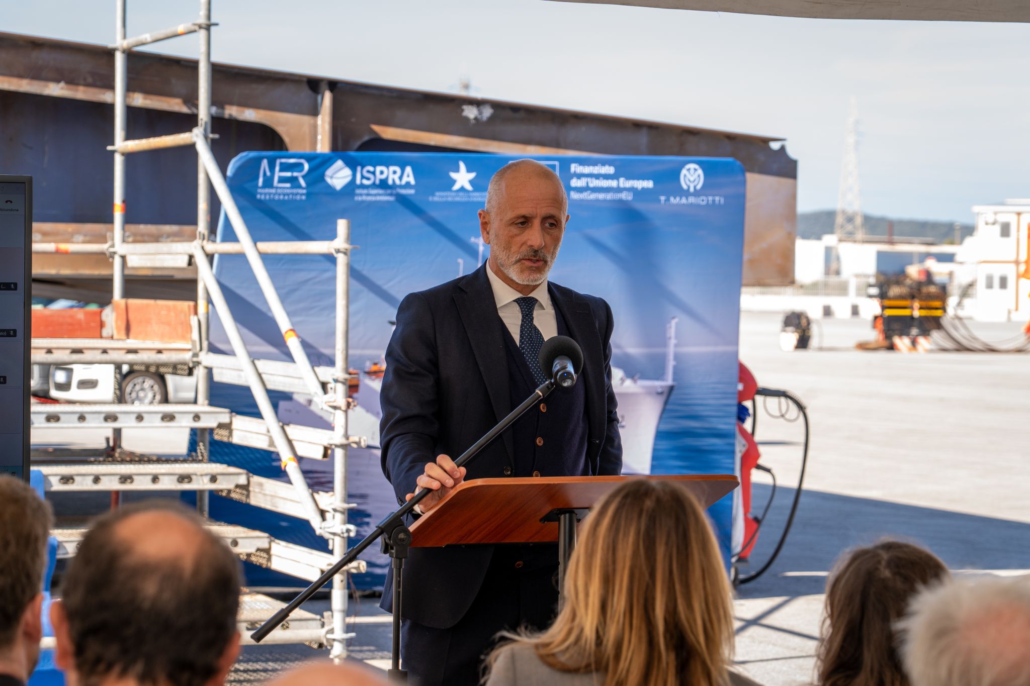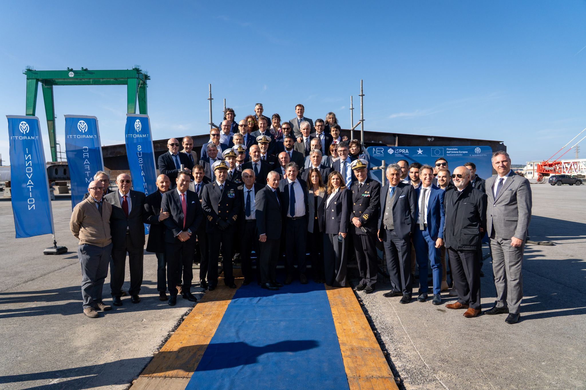 The keel-laying and coin ceremony for the new oceanographic vessel Arcadia, destined for the Italian Institute for Environmental Protection and Research (ISPRA), took place today at the Piombino Industrie Marittime (PIM) shipyard. The event was attended by officials and representatives from ISPRA, the Italian Navy, and the management of both T. Mariotti S.p.A. Shipyard and Piombino Industrie Marittime.